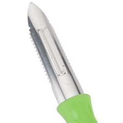 - This Peeler has serrated blade quickly peels soft skinned fruits and vegetables.