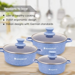 The wonder chef die cast granite casserole features a durable die-cast aluminum construction with a granite non-stick coating, providing even heat distribution and easy food release. Check the specific product for capacity and additional features.